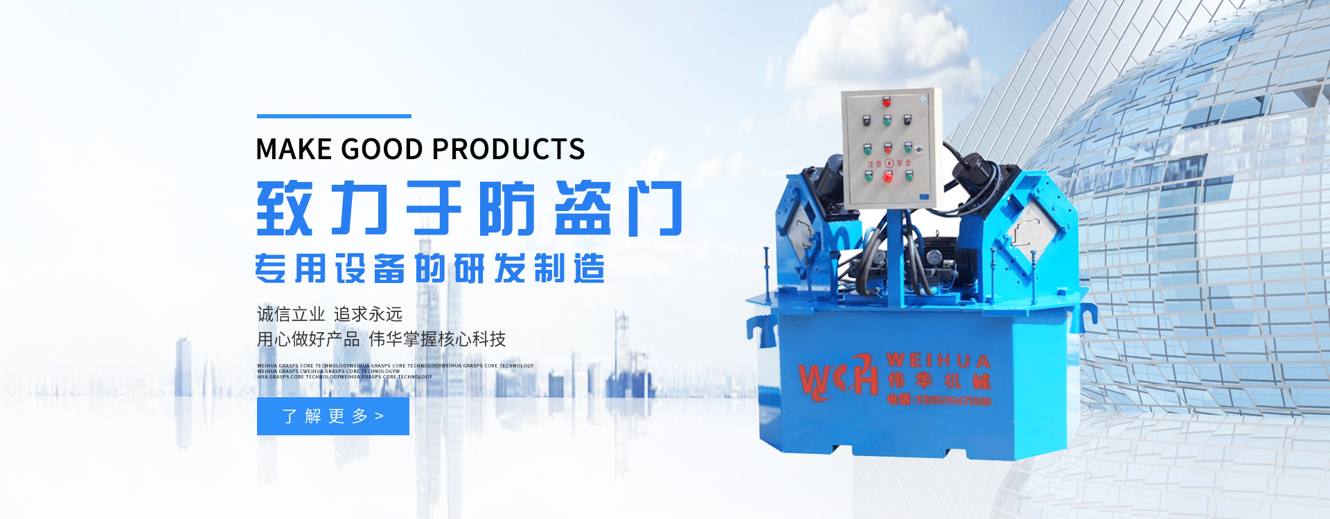 公司生產(chǎn)防盜門(mén)專(zhuān)用設(shè)備,如LWG-400/500型防盜門(mén)外框成型機(jī)、LWG-100/300型防盜45o液壓沖剪機(jī)、LWG-1200滾花機(jī)、ZHHJ-180專(zhuān)用組合焊接機(jī)、LWG-600型內(nèi)外門(mén)板自動(dòng)化流水線(xiàn)等,產(chǎn)品行銷(xiāo)全國(guó)各地,并遠(yuǎn)銷(xiāo)東南亞、歐州、美洲、非洲等近10多個(gè)國(guó)家和地區(qū)。